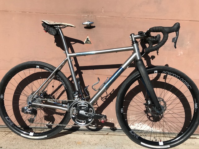 The gravel frame I designed as a counterpart to the New Frontier is called I Know You Rider, an obvious call-out to the Grateful Dead. The graphics include a recreation of a ticket stub I found in my desk from the Boston Garden in 1992. Unlike the Garden, the bike is comfortable and sounds great. The frames, along with a very similar one for Mrs. Mamil, were manufactured by Waltly Titanium, and have been excellent bicycles. I designed all 3 frames frames to clear 2″ tires.