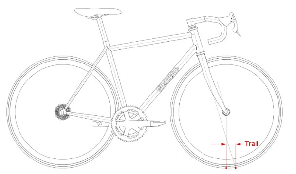 Trail can be a hard concept to wrap your head around, so let’s review: draw a line throught the head tube to the ground, at the head tube angle (basically, the center of the steerer tube). Now draw a vertical line through the axle, perpendicular to the ground. The vertical line intersects the ground aft of the head tube line. This vertical line moves closer or farther to the head tube line based on the fork offset (also called rake).